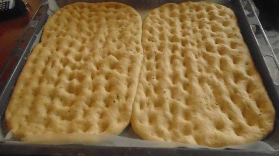 Όταν φουσκώσει, την πατάμε με τα δάχτυλά μας και τις κάνουμε βαθουλώματα.Ψήνουμε σε προθερμασμένο φούρνο, στον αέρα, στους 170°C, για 30′ – 40′ περίπου, ανάλογα με την κουζίνα μας, ώσπου να ροδοκοκκινίσει.