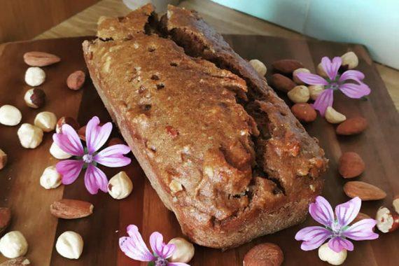 Χαμηλώνουμε την ταχύτητα στο μίξερ και προσθέτουμε σιγά σιγά ο αλεύρι. Όταν είναι έτοιμο το μείγμα, σταματάμε το μίξερ, προσθέτουμε τους ξηρούς καρπούς, τους χουρμάδες και ανακατεύουμε με μαρίζ. Βάζουμε το μείγμα σε μια φόρμα και ψήνουμε το κέικ μας σε προθερμασμένο φούρνο στους 180 βαθμούς Κελσίου.