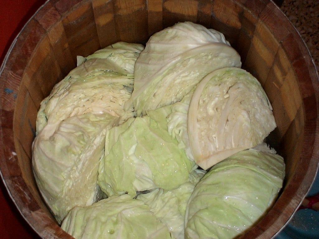 Τοποθετούμε το βαρέλι όχι στο πάτωμα, αλλά σε κάποιο ύψος, πάνω σε κάποιο τελάρο για παράδειγμα, ωστε να μπορούμε να αδειάζουμε άνετα από την τρύπα του το νερό. Βάζουμε στο βαρέλι (από το οποίο έχουμε βγάλει τα φύλλα και το ‘χουμε ξεπλύνει φυσικά) μια χούφτα ρεβύθια, μια χούφτα αλεύρι και από πάνω τα λάχανα: