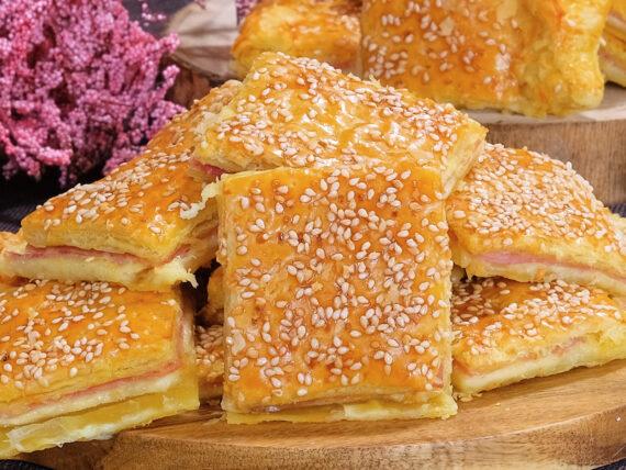 850 g puff pastry 15 slices of Gouda cheese 15 slices of ham ——————————————————— 1 medium egg sesame ——————————————————- 35×42 cm