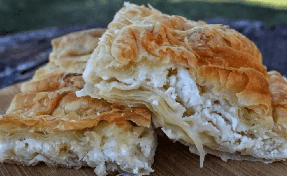 400ml χλιαρό νερό (400ml lukewarm water) 1 κ.γ. αλάτι (1 tsp. salt) 70ml ελαιόλαδο (70ml olive oil) 750γρ. αλεύρι “Κούλα” (750gr. soft wheat flour) 250γρ. λιωμένο βιτάμ ή βούτυρο (250gr. melted butter) 400γρ. φέτα (400gr. greek feta)