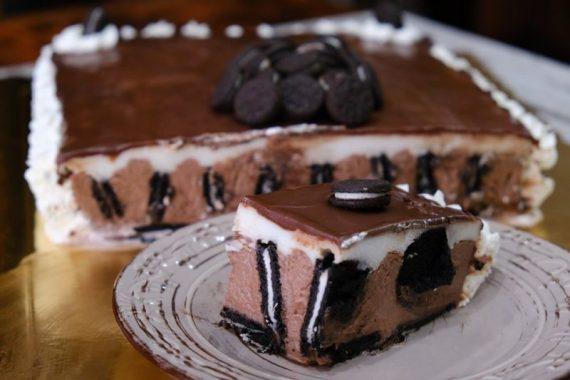 Εκτέλεση Σε ένα ταψί 25χ30 στρώνουμε μεμβράνη και βουτάμε στο γάλα τα μπισκότα ορεο και κάνουμε την βάση.