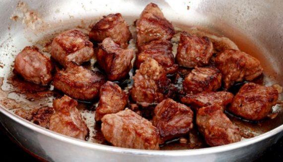 Βάζουμε το βούτυρο στο τηγάνι να κάψει και ρίχνουμε μέσα τα κομματάκια χοιρινού, το κρεμμύδι και την πιπεριά μαζί με την πάπρικα, το κύμινο, τη ρίγανη και το αλατοπίπερο και σοτάρουμε καλά για περίπου 10 λεπτά, ανακατεύοντας συνεχώς το κρέας για να πάρει βράση από όλες τις μεριές.