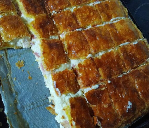 Η πίτα της Κυριακής : Συνταγή για Τραγανή Ζαμπονοκασερόπιτα με μπεσαμέλ και φέτα. Γκουντα, μοτσαρέλα, μπέικον και ζαμπόν .