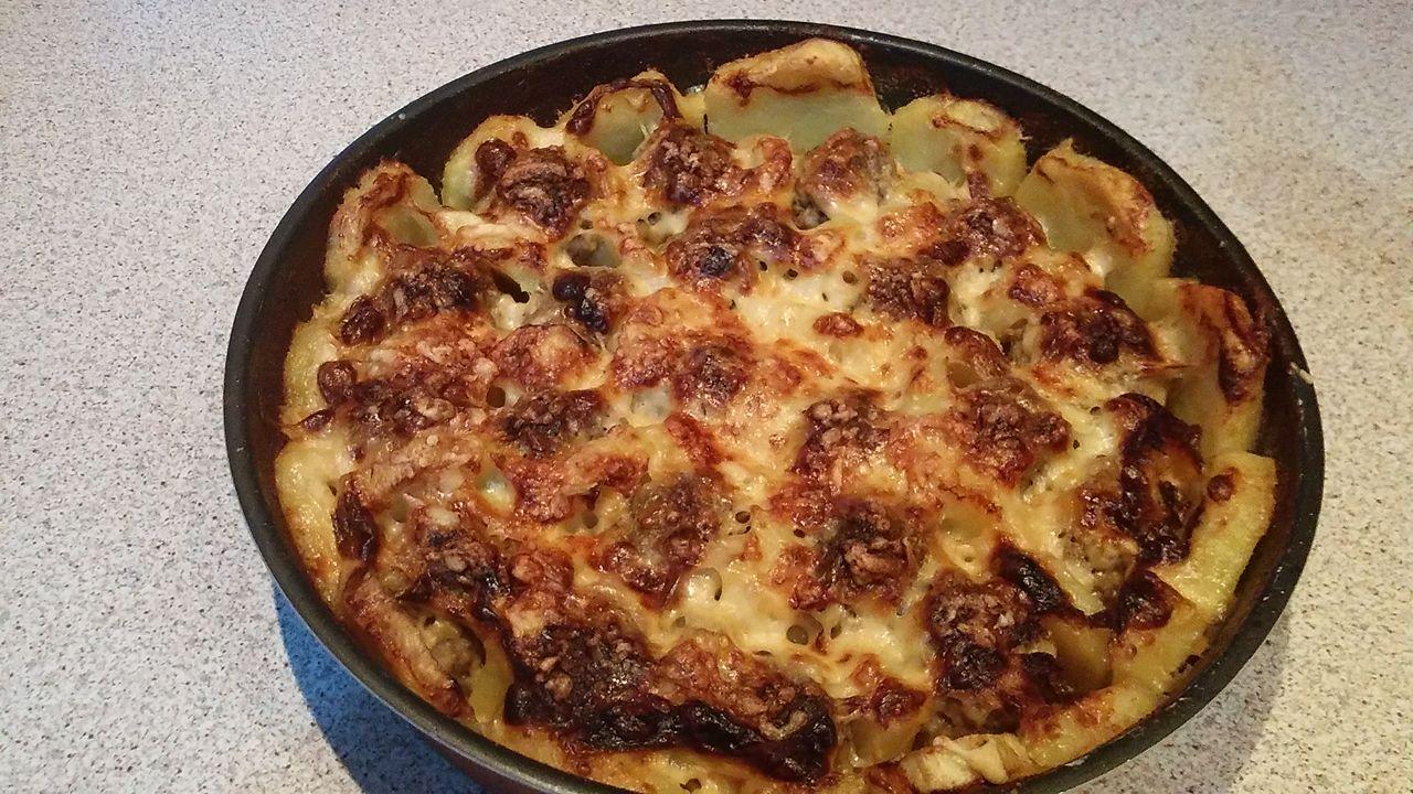 Εκτέλεση: Καθαρίζουμε τις πατάτες και τις βάζουμε για βράσιμο με λίγο αλάτι. Τις βράζουμε ελαφρώς μέχρι να τσιμπιούνται. Τις αφήνουμε να κρυώσουν και τις κόβουμε σε ροδέλες πάχους 1/2 εκ. περίπου. Στο μεταξύ ζυμώνουμε το κιμά με τα υπόλοιπα υλικά και πλάθουμε μπαλίτσες τα κεφτεδάκια. Σ’ ένα μικρό ταψί, αλείφουμε ελάχιστο ελαιόλαδο με πινέλο και καλύπτουμε με τις φέτες πατάτες καθώς και ολόγυρα του ταψιού. Πασπαλίζουμε με κοκκινοπίπερο και λίγο αλάτι και ύστερα τοποθετούμε τα κεφτεδάκια από πάνω και ανάμεσά τους πατάτες. (όπως βλέπετε στη φωτογραφία).