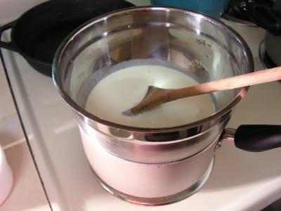 Βάλτε λίγο νερό να βράσει σε μια μεγάλη κατσαρόλα. Μειώστε τη φωτιά σε μέτρια προς χαμηλή, ώστε το νερό μόλις να σιγοβράζει. Ρίχνουμε την κρέμα σε ένα μεταλλικό μπολ, στη συνέχεια, τοποθετήστε το μπολ στην κατσαρόλα- Μπαιν Μαρί .