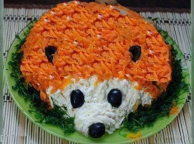 Κόβουμε το λάχανο για σαλάτα το τρίβουμε με το αλάτι και το λεμόνι βάζουμε την μαγιονέζα και το λάδι και ανακατεύουμε καλά . στρώνουμε ενα στρογγυλό μπολ με μεμβράνη βάζουμε τη σαλάτα πιέζουμε καλά να πάρει τη φόρμα του μπολ και βάζουμε στο ψυγείο. τρίβουμε το καρότο στον τρίφτη και λίγο πριν σερβίρουμε ανακατεύουμε το καρότο με λίγο λεμόνι λάδι και αλάτι αναποδογυρίζουμε σε πιατέλα τη λαχανοσαλατα δίνουμε το σχήμα της μουσουδιτσας απο το σκαντζιχοιρακι και στολίζουμε με το καρότο τον άνηθο και τις ελιές όπως στην φωτογραφία . . Εαν θελετε να παρετε και αλλες ιδεες για σαλατες για παιδικο παρτυ πατηστε εδω