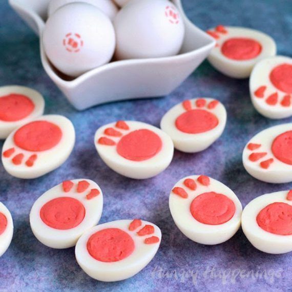 Βάλτε το μείγμα σε ένα κορνέ και γεμίστε τα ασπράδια.Φροντίστε να σχηματίσετε και τα δάχτυλα του λαγού!Βρέξτε ελαφρά το δάχτυλο σας με λίγο νερό και πατήστε την γέμιση για να γίνει λεία στην επιφάνεια.