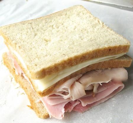 Ψωμί 1 ή 2 φέτες του ζαμπόν 1 ή 2 φέτες γαλοπούλας βουτυρωμένα φέτες ψωμί 1 ή 2 φέτες τυρί Γκούντα η ενταμ ,Και μια άλλη φέτα ψωμί από πάνω.