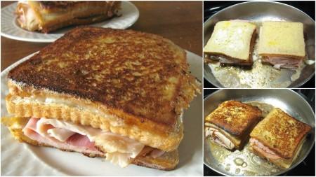 Όταν το βούτυρο κάψει τοποθετήστε το σάντουιτς στο τηγάνι. Μαγειρέψτε έως ότου πάρει χρώμα .Αν απορροφηθεί όλο το βούτυρο, προσθέστε μια άλλη κουταλιά στο τηγάνι, αφήνοντάς το να λιώσει πριν από το τηγάνισμα στην άλλη πλευρά του το σάντουιτς, μέχρι να ροδίσει.
