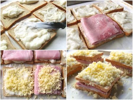 Όταν πήξει η μπεσαμέλ, απλώστε το στο ψωμί –και στις 8 φέτες έτσι ώστε να έχετε οκτώ φέτες ψωμί με σάλτσα καλύπτοντας και τις γωνίες κάθε φέτας. Τοποθετήστε το ζαμπόν στις τέσσερις από τις φέτες