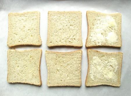 Αυτό είναι ένα τριπλό σάντουιτς, έτσι για δύο σάντουιτς, ξεκινήστε με έξι φέτες ψωμί. Βουτυρώστε τα δυο από αυτά, από τις δύο πλευρές .αυτές θα είναι το μεσαίο στρώμα του ψωμιού.