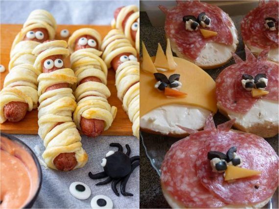 Κάνετε μούμιες τα λουκάνικα σας, με ζύμη πίτσας. Φτιάξτε το ζυμαράκι που φτιάχνετε για την πίτσα, τυλίξτε όπως στην φωτογραφία τα λουκάνικα σας, βάλτε για ματάκια κόκκους πιπεριού και έτοιμα!
