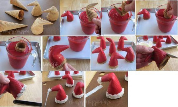 Λιώστε την σοκολάτα (κρατήστε λίγη λευκή για τις λεπτομέρειες να την λιώσετε μετά ) και χρωματίστε με κόκκινο χρώμα ,βουτάτε τα σκουφάκια μέσα και αφήστε να στεγνώσουν .