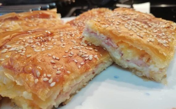 Υλικά 500 γρ. φύλλο κρούστας για γλυκά 1/2 κούπας σπορέλαιο ή ΒΙΤΑΜ λιωμένο 300 γρ. κασέρια διάφορα τριμμένα 2 λουκάνικα της επιλογής μας σε φετάκια 2-3 φέτες ζαμπόν ή μπέικον σε κομματάκια 1 πιπεριά πράσινη σε ροδέλες 6-7 κ.σ. κον κασέ ή 1 μέτρια ντομάτα τριμμένη 1/2 κούπας νερό