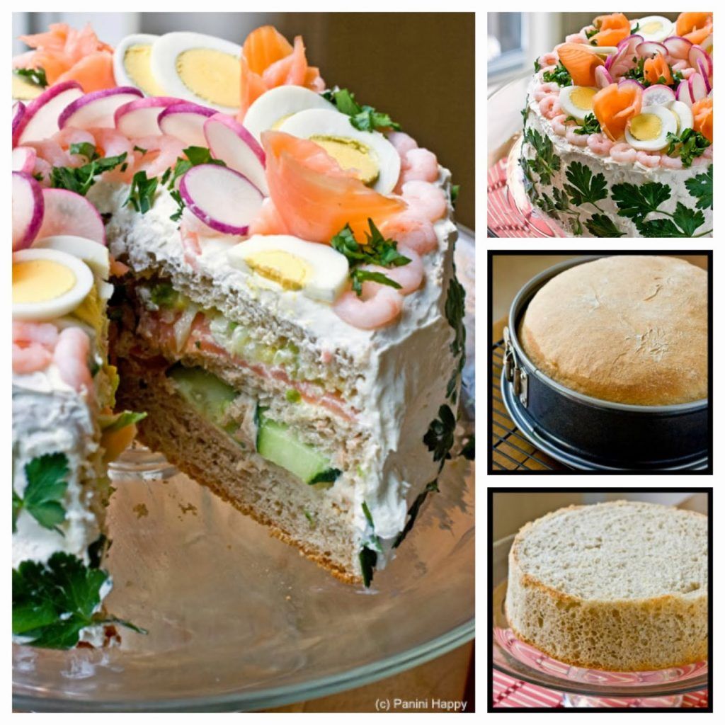Για τη βάση μπορείς να χρησιμοποιήσεις φέτες του τοστ (οπότε και η αλμυρή “τούρτα” σου θα πάρει ορθογωνιο σχήμα) ή καρβέλι ψωμί από το οποίο θα έχεις αφαιρέσει την κόρα και θα το οποίο θα έχεις κόψει στη μέση, κατά μήκος (όπως θα έκανες με το παντεσπάνι) έτσι ώστε η “τουρτίτσα” να γίνει κλασικά στρογγυλή.