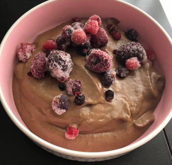 Παίρνουμε όλα τα υλικά μαζί και τα χτυπάμε στο μούλτι να ομογενοποιηθούν. Τα βάζουμε σε ένα μπολ και σερβίρουμε με φρέσκα φρούτα της επιλογής μας.