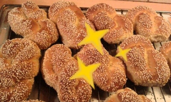 Προετοιμασία Ανακατεύουμε όλα τα υλικά και φτιαχνουμε μια μαλακή και απαλή ζυμη. Την αφηνουμε να διπλασιαστεί σε ογκο. Κόβουμε μικρά μπαλάκια …όσο ένα μανταρίνι…το ανοιγουμε σε φύλλο χοντρό , βάζουμε λιγο τυρακι μεσα και κλεινουμε. Βουταμε στο νερο με τη μελασα και μετα στο σουσαμι. Τοποθετουμε σε ταψι και κανουμε με ενα κοφτερο μαχαιρι..απο 2 χαρακιες στο καθε ένα. Αφήνουμε να ξεκουραστούν για 20 λεπτα και ψήνουμε σε προθερμασμένο φούρνο στους 190 β. για 20 με 30 λεπτα..ανάλογα το φουρνο. (Αν εχετε αρτοπαρασκευαστή…ρίχνετε ολα τα υλικα μέσα και αφήνετε να κανει ολη τη δουλεια και εσεις ξεκουραζεστε) (στη γεμιση, μπορείτε να αυτοσχεδιάσετε..και να βάλετε ό,τι σας αρέσει)