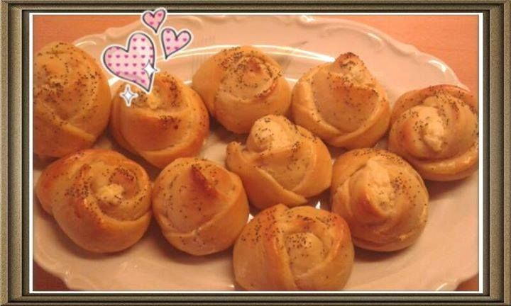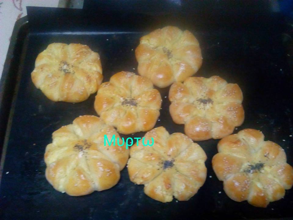 2 ποτήρια του νερού χλιαρό γαλα (να σημειωσω οτι οταν σημειωσα στο τετραδιο μου τη ζυμη ..εγραψα 2 ποτηρια χλιαρο νερο αντι για γαλα…μια χαρα εγινε) 1 ποτηρι του νερου λαδι. μειον ενα δαχτυλο 2 αυγα, (κραταμε τον ενα κροκο για επαλειψη) 1 κγ ζαχαρη 1,5 κγ αλατι 2 φακ μαγια 7,5 με 8 ποτηρια αλευρι γοχ για την επαλειψη τον κροκο αυγου που κρατησαμε και 1 κγ γιαουρτι (αν δεν εχετε γιαουρτι, τον αραιωνουμε με γαλα) Ζυμωνουμε μεχρι να εχουμε μια απαλη και μαλακη ζυμη, χωρις να κολλαει στα χερια. Αφηνουμε να ξεκουραστει και να φουσκωσει. Μετα κοβουμε σε μικρα μπαλακια, σαν μανταρινι. Ανοιγουμε το καθε μπαλακι σε στρογγυλο φυλλο, Βαζουμε τη γεμιση της αρεσκειας μας , κλεινουμε καλά. Ξανανοιγουμε σε φυλλαρακι ,λιγο παχουλο Κοβουμε με το μαχαιρι το φυλλο μας , ακτινωτα το καθε πεταλο που δημιουργηθηκε το στριβουμε μια φορα Τοποθετουμε στο ταψι μας. αφηνουμε να ξεκουραστουν για 1 τεταρτο και αυγουλωνουμε και πασπαλιζουμε αν θελουμε με σουσαμι και παπαρουνοσπορο. ψηνουμε στους 180 β σε προθερμασμενο φουρνο, μεχρι να ροδισουν.