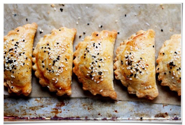 Πιέζουμε κάθε κομμάτι με την παλάμη μου πάνω σε μια επίπεδη και ελαφρώς αλευρωμένη επιφάνεια για να γίνει ένας δίσκος με διάμετρο περίπου 10 εκ. Στο κέντρο κάθε δίσκου βάζουμε από 1 κουτ. γλυκού γέμιση. Βρέχουμε κάθε δίσκο ζύμης περιμετρικά με λίγο νεράκι και τον διπλώνουμε στη μέση, ώστε να καλύπτουμε τη ζύμη και να φτιάξουμε ένα μικρό μισοφέγγαρο. Προθερμαίνουμε το φούρνο στους 180 C. Στρώνουμε χαρτί ψησίματος ένα μεγάλο ταψί και βάζουμε εκεί τα πιτάκια, αφήνοντας μικρή απόσταση μεταξύ τους. Σε ένα μπολάκι ανακατεύουμε τον κρόκο του αυγού με το γάλα και με το μείγμα αυτό αλείφουμε τα πιτάκια με ένα πινέλο. Τα πασπαλίζουμε με λίγο σουσάμι και τα ψήνουμε για 30 λεπτά, μέχρι να ροδίσουν.