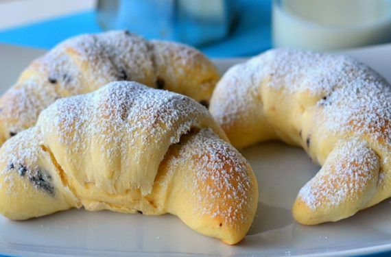 Βάλτε τη ζύμη σε ένα μπολ και αφήστε τη να ξεκουραστεί για 3 ώρες. Μόλις περάσει ο χρόνος, ανοίξτε τη ζύμη σε μια αλευρωμένη επιφάνεια και σχηματίστε έναν κύκλο με πάχος μισό εκατοστό. Με ένα μαχαίρι κόψτε κομμάτια σε σχήμα μισοφέγγαρου και διπλώστε τα γύρω από τον εαυτό τους, ώστε να σχηματίσετε τα κρουασάν.