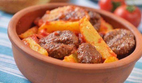Υλικά συνταγής 1 μερίδα κεφτεδάκια (βλέπε υλικά και εκτέλεση συνταγής εδώ) 3 μεγάλες ή 4 μέτριες πατάτες κομμένες κυδωνάτες Για τη σάλτσα: 3 ώριμες φρέσκες ντομάτες, τριμμένες 1 κ.σ. ντοματοπελτέ + 1/2 κ.γ. ζάχαρη 1 κύβο βοδινού διαλυμένο σε 2 φλ. τσαγιού νερό