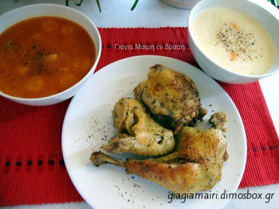 όταν είναι έτοιμη την στραγγίζουμε και περνάμε το ζουμάκι από ψιλό σουρωτήρι πετάμε το κρεμμύδι και το ζουμάκι το χωρίζουμε σε δυο κατσαρόλες μετρώντας πόσα ποτήρια είναι αν θέλετε συμπληρώνετε και ένα δυο ποτήρια νερό στην κάθε κατσαρόλα και τις βάζετε να πάρουν βράση ξανά βάζοντας μέσα στο ζουμάκι κομμένες πατάτες καρότα και από 2 μικρά κρεμμύδια, στην κατσαρόλα που θα βάλετε τον τραχανά ρίχνετε και την ντομάτα και όσο ποτήρια ζωμός ήταν άλλες τόσες κουταλιές της σούπας τραχανά χαμηλώνετε την φωτιά και περιμένετε να βράσουν και να δέσουν τα υλικά σας και είναι έτοιμη για σερβίρισμα με μπόλικο πιπεράκι!!!!!!!!!!!! στην κατσαρόλα με το ρυζάκι ρίχνετε πάλι τα ίδια υλικά και στην συνέχεια το ρυζάκι σας αν θέλετε την σούπα πηχτή θα μετρήσετε κουταλιές της σούπας ρύζι αν θέλετε την σούπα νερουλή θα βάλετε κουταλάκια του γλυκού όσα ποτήρια ζωμό τόσα κουταλάκια!!!! στην δεύτερη σούπα όταν είναι έτοιμη κάνετε το αυγολέμονο!!! στον χρόνο που βράζουν οι σουπίτσες μας βάζουμε το κοτόπουλο σε ένα ταψάκι με αλατοπίπερο ρίγανη λίγο λαδάκι και μουστάρδα και το ψήνουμε στο γκριλ μέχρι να πάρει χρώμα!!!
