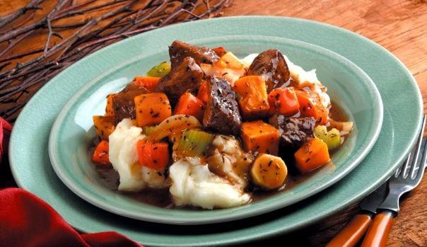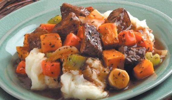 700 γρ. μοσχάρι μοσχάρι χτένι σπάλας σπαλομίτα, κομμένο σε μικρούς κύβους 4 κ.σ. μαγιονέζα 3 κ.σ. αλεύρι για όλες τις χρήσεις 1/3 φλ. τσαγιού ελαιόλαδο 1 μεγάλο ξερό κρεμμύδι, κομμένο πρώτα οριζόντια και μετά σε φέτες 2 καρότα, καθαρισμένα κομμένα σε κομμάτια 1,5εκ. περίπου 2 κλωνάρα σέλερι, κομμένα σε κομμάτια 1,5 εκ. περίπου 1 πατάτα, κομμένη σε κύβους 1,5 εκ. περίπου 200 γρ. μανιτάρια άσπρα, μικρά ολόκληρα ή μεγάλα κομμένα στα 2 ή στα 3 2 σκελίδες σκόρδο, κομμένες σε λεπτές φέτες 2 γεμάτες κ.σ. πελτέ ντομάτες