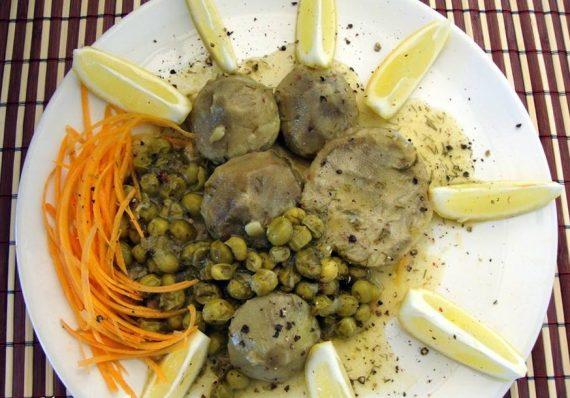 10 με 12 αγκινάρες 1/2 κιλό φρέσκος αρακάς 1 μεγάλο κρεμμύδι χοντροκομμένο μια χούφτα κρεμμυδάκια φρέσκα ψιλοκομμένα μια χούφτα άνηθο ψιλοκομμένο 1 ποτηράκι του κρασιού ελαιόλαδο 1 ζωμό λαχανικών