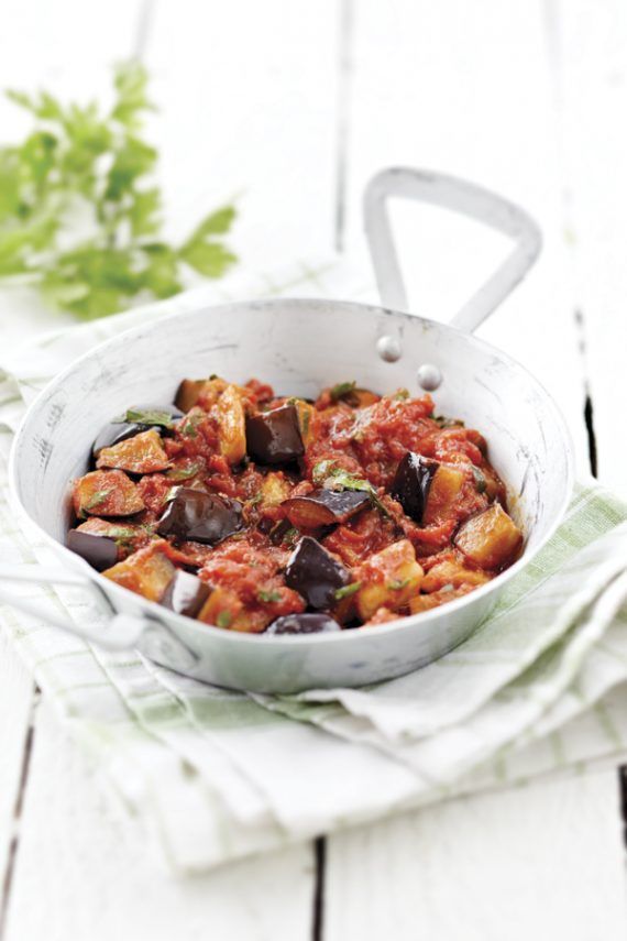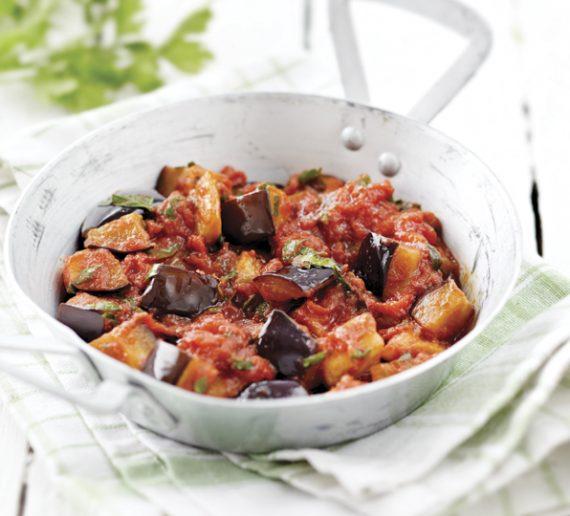 Εκτέλεση Πλένουμε τις μελιτζάνες, αφαιρούμε το κοτσάνι και τις άκρες και τις κόβουμε σε μικρούς κύβους (περίπου 2 εκ.). Τις αλατίζουμε και τις αφήνουμε στο σουρωτήρι για τουλάχιστον 30 λεπτά. Τις ξεπλένουμε, τις στύβουμε και τις στεγνώνουμε με μπόλικο χαρτί κουζίνας. Σε ένα μεγάλο τηγάνι βάζουμε το λάδι να κάψει και τσιγαρίζουμε το κρεμμύδι με το σκόρδο μέχρι να μαραθούν και να γυαλίσουν. Ρίχνουμε και τις μελιτζάνες να τσιγαριστούν και τις γυρνάμε με μια ξύλινη σπάτουλα να πάρουν χρώμα απ’ όλες τις πλευρές, για 7-8 λεπτά.