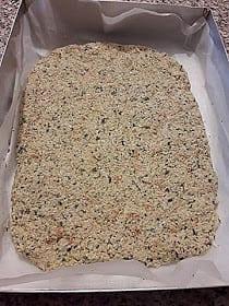 Σε ένα ταψάκι τετράγωνο στρώνουμε λαδόκολλα και απλώνουμε το μείγμα να πάει παντού και να έχει ίσο πάχος ( βρέχουμε λίγο χεράκια να μη κολλάει )