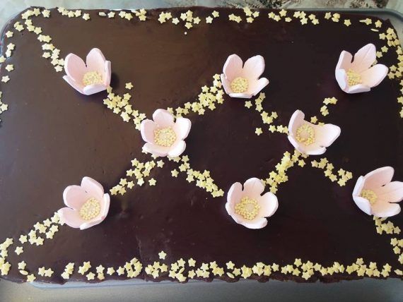 Υλικά 500 γρ. μελομακάρονα 500 γρ. κουβερτούρα 2 κουταλιες της σουπας . μέλι 2 κ.γ. κανέλα 500γρ. κρέμα γάλακτος φυτικη ΕΚΤΕΛΕΣΗ Θρυμματίζουμε τα μελομακάρονα και τα στρώνουμε σε ένα τσέρκι μακροστενο πάνω σε λαδόκολλα. Πιέζουμε με την παλάμη μας προς τα κάτω να γίνουν μια συμπαγής και επίπεδη βάση! Τεμαχίζουμε τη σοκολάτα σε μικρά κομμάτια και τη βάζουμε σε ένα μπολ μαζί με το μέλι και την κανέλα. Ζεσταίνουμε την κρέμα γάλακτος και λίγο πριν βράσει την αδειάζουμε πάνω από τη σοκολάτα . Ανακατεύουμε ώστε να γίνει ένα λείο σοκολατένιο μείγμα . . Από πάνω ρίχνουμε το μείγμα της σοκολάτας και βάζουμε στο ψυγείο για τουλάχιστον 3 ώρες, έως ότου παγώσει καλά και σταθεροποιηθεί. Ξεφορμάρουμε και στολιζουμε με λουλουδακια απο ζαχαροπαστα! Ειναι σκετη κολαση!