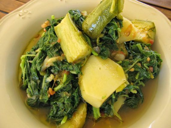 1κιλό βλίτα (μόνο τα φύλλα και τα πολύ τρυφερά κοτσάνια) 580γρ κολοκυθάκια 650γρ πατάτες 1κσ αλάτι 165γρ ξηρό λευκό κρασί 3φλ καφέ ζεστό νερό 3 ντομάτες ώριμες τριμμένες στον τρίφτη