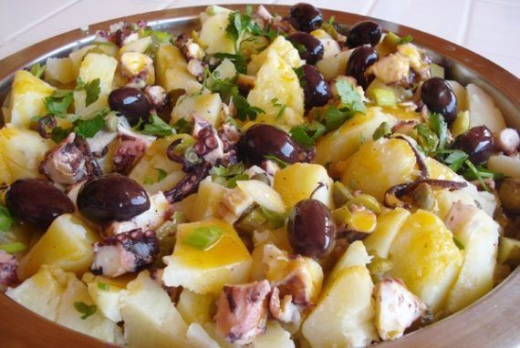 Χταπόδι 1 κιλό Δάφνη 1 τεμ Μπαχάρι 2 τεμ Κρασί 1/2 κούπα τσαγιού Πατάτες 500 γρ κομμένες Κρεμμυδάκια φρέσκα 3-4 τεμ Αγγουράκια τουρσί 3-4 τεμ Ελιές μαύρες 10 τεμ Κάπαρη 1 1/2 κουταλιά της σούπας Μουστάρδα 1 κουτάλι της σούπας Ξύδι 5 κουταλιές της σούπας Λεμόνι χυμό από ένα λεμόνι Αλάτι-πιπέρι Πάπρικα γλυκιά 1 κουτάλι της σούπας Ελαιόλαδο 1 κούπα τσαγιού Μαϊντανός 1/2 ματσάκι