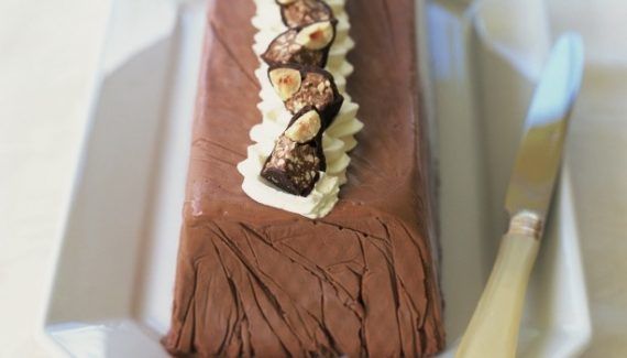 Βουτυρώνουμε μια φόρμα του κέϊκ 25 x 11 εκ. και τη στρώνουμε με μια μεμβράνη. Μεταφέρουμε το μείγμα στη φόρμα το ισιάζουμε στην επιφάνεια με μια μαρίζ και το αφήνουμε στη κατάψυξη μέχρι να παγώσει [προτιμήστε και όλο το βράδυ]. Το βγάζουμε από τη κατάψυξη, βυθίζουμε τη βάση της φόρμας σε λίγο ζεστό νερό και μετά αναποδογυρίζουμε το παγωτό σε μια πιατέλα και βγάζουμε τη μεμβράνη. Για το σερβίρισμα προαιρετικά γαρνίρουμε με την επιπλέον κρέμα γάλακτος και τα σοκολατάκια κομμένα στη μέση.