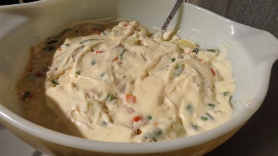 Υλικά 1 κομμάτι φιλέτο κοτόπουλο στήθος 1 πακέτο διάφορα κατεψυγμένα λαχανικά 1 βαζάκι μεσαίο μέγεθος μαγιονέζα 4 πατάτες μέτριες ξύσμα από ένα λεμόνι χυμό από ένα λεμόνι 2 κουταλιές ελαιόλαδο [προαιρετικά] αλάτι -πιπέρι