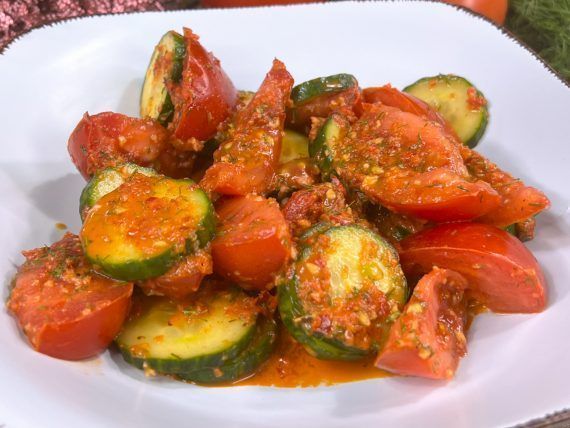 1 medium cucumber 2 medium tomatoes ————————————— 1 medium red pepper 2 tbsp olive oil 1 tbsp balsamic vinegar 1/2 tsp honey 2 garlic cloves 1 tsp sweet paprika 1/2 tsp salt —————————————– A little dill oregano