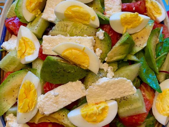Καλοκαιρινή σαλάτα με αβοκάντο. Καλοκαιρινή σαλάτα με ρόκα, σπανάκι, κόκκινο και πράσινο λάχανο, αυγά, ντομάτα, αγγούρι και φέτα για το τραπέζι του Δεκαπενταύγουστου.
