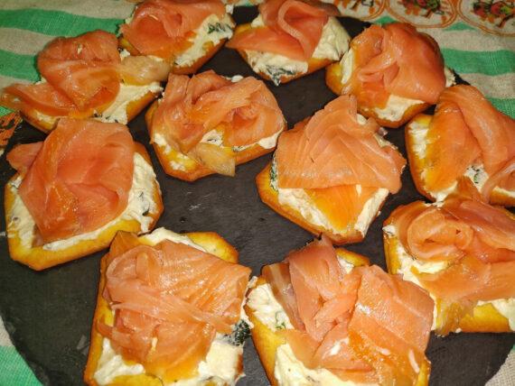 Παίρνουμε τα κράκερ και τα αλείφουμε με λίγο από το τυρί κρέμα από πάνω. Κόβουμε τον σολομό σε λωρίδες και τον βάζουμε πάνω από κάθε κράκερ. Σερβίρουμε σε μία πιατέλα με λίγο έξτρα φρέσκο ελαιόλαδο.