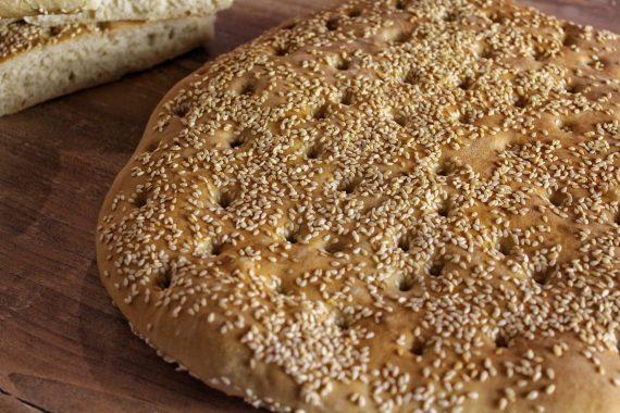 Καλύπτουμε με μεμβράνη και αφήνουμε για 1 ώρα και 30′ λεπτά σε ζεστό μέρος, να διπλασιαστεί η ζύμη μας. Σε αλευρωμένη επιφάνεια, με λαδωμένα χέρια δουλεύουμε το ζυμάρι μας, πλάθουμε ένα μπαστούνι, το κόβουμε στα δύο και ανοίγουμε με τον πλάστη φύλλο σε πάχος 1 εκ. με 2 εκ., βάζουμε σε ταψί με λαδόκολλα, σκεπάζουμε με πετσέτα κουζίνας και αφήνουμε σε ζεστό μέρος να διπλασιαστεί. Αλείφουμε με ζαχαρόνερο, πασπαλίζουμε με σουσάμι, τρυπάμε την επιφάνεια και ψήνουμε σε προθερμασμένο φούρνο στις αντιστάσεις, στους 220 βαθμούς, για 20′ λεπτά.