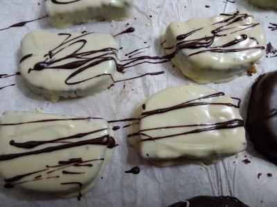 Σε κατσαρόλα βράζουμε για 5 λεπτά ζάχαρη με το νερό κακάο και κανέλα. Κατεβάζουμε από την φωτιά και προσθέτουμε την φρυγανιά το κονιάκ και τα καρύδια. Αφήνουμε να κρυώσει το πλάθουμε σε κορμό λεπτό και το βάζουμε στο ψυγείο να παγώσει και να σφίξει. Το κόβουμε σε κομμάτια πάχους ενός εκατοστού. Έχουμε λιώσει τις κουβερτούρες -εδώ λευκή και μαύρη -τις βουτάμε και τις ακουμπάμε σε λαδόκολλα ή σε σχάρα να παγώσουν .