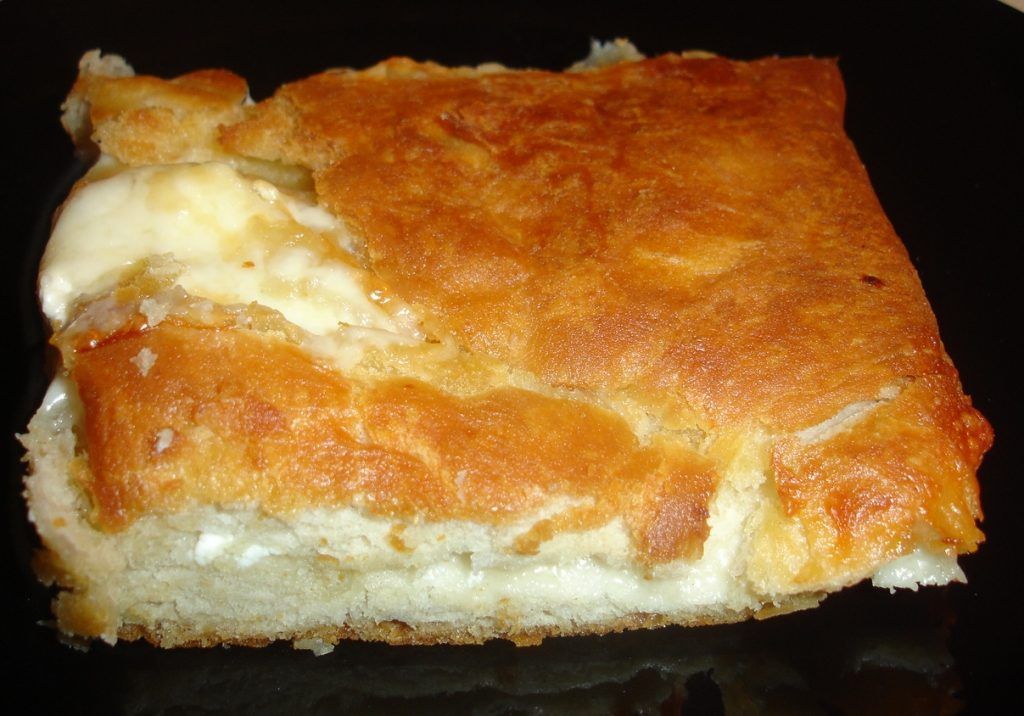 Ανοίγουμε πάλι το χοντρό φύλλο και μοιράζουμε στην επιφάνειά του το κασέρι, κομμένο σε χοντρά κομμάτια και τη θρυμματισμένη φέτα. Κλείνουμε το φύλλο σε πακέτο, φέρνοντας τις άκρες του στη μέση, λαδώνουμε την επιφάνεια και ψήνουμε την πίτα στους 180 βαθμούς για 1 ώρα περίπου.