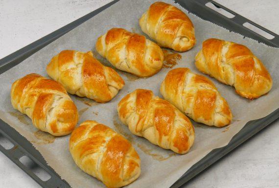 Διαλύουμε την μαγιά και την ζάχαρη στο χλιαρό γάλα και το χλιαρό νερό. Προσθέτουμε το σπορέλαιο, το αυγό, το ασπράδι και ανακατεύουμε. Ρίχνουμε περίπου το μισό αλεύρι, το αλάτι και δουλεύουμε. Ενσωματώνουμε σιγά σιγά το υπόλοιπο αλεύρι μέχρι που να γίνει ζύμη. Την σκεπάζουμε και αφήνουμε για 30 λεπτά να ξεκουραστεί. Όταν είναι έτοιμη την πλάθουμε ελαφρώς και την χωρίζουμε σε 16 μπαλάκια. Σε λαδωμένη επιφάνεια τα ανοίγουμε σε μακρόστενα φύλλα με τα χέρια. Στην μία άκρη τοποθετούμε κασέρι και τυλίγουμε μέχρι την μέση. Χωρίζουμε το υπόλοιπο φύλλο σε 4 λωρίδες και δίνουμε σχήμα. Τα βάζουμε σε ταψί με αντικολλητικό χαρτί, αλείφουμε με κρόκο αυγού και ψήνουμε στους 180 βαθμούς μέχρι να ροδίσουν.