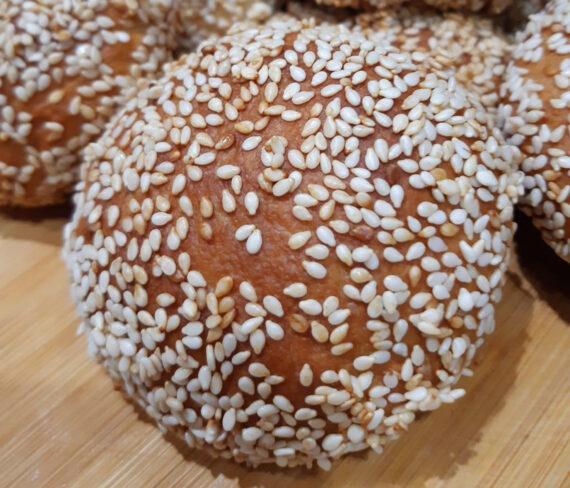 Τα βουτάμε στο μελονερο και στο σουσάμι τα τοποθετούμε στο ταψί με λαδόκολλα και αφηνουμε να φουσκώσουν για 20 λεπτα , μόλις φουσκώσουν, ψήνουμε σε προθερμασμενο φούρνο στους 190 βαθμούς μέχρι να ροδίσουν.