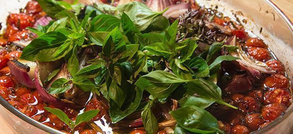 - Βάζετε το σκεύος στον φούρνο για μια ώρα περίπου, μέχρι να δείτε ότι τα κρεμμύδια αρχίζουν να μαυρίζουν στις άκρες. Αφαιρείτε το σκεύος απ’ τον φούρνο και προσθέτετε από πάνω τον φρέσκο βασιλικό (ή τον μαϊντανό, τον χειμώνα).