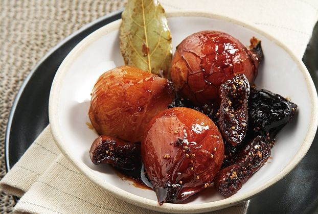 1 κιλό μικρά μακρόστενα ξερά κρεμμύδια 3 κ.σ. ελαιόλαδο 1 δαφνόφυλλο 4 αποξηραμένα τσαπελόσυκα Εύβοιας 4 απυρήνωτα δαμάσκηνα 1 φλ. τσαγιού μαυροδάφνη Πατρών αλάτι φρεσκοτριμμένο πιπέρι