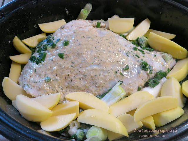 Βάζουμε το κρέας και τις πατάτες χοντροκομμένες τις αλατίζουμε και ρίχνουμε και το πιπέρι. Σε ένα σέικερ ή σε ένα βαζάκι βάζουμε το λάδι, το κρασί, τη μουστάρδα, το χυμό λεμονιού και τα υπόλοιπα μυρωδικά τα χτυπάμε να χυλώσουν και περιλούζουμε το κρέας και τις πατάτες. Περιλούζουμε με 2-3 κουταλιές ελαιόλαδο ακόμη και κλίνουμε τη γάστρα με τη λαδόκολλα και το καπάκι.