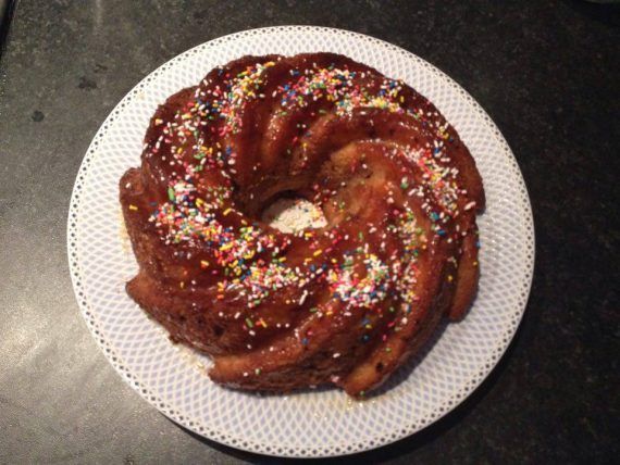 Χτυπαμε τα αυγα με τη ζαχαρη μεχρι να γινουν κρεμα.Προσθετουμε σιγα σιγα το ελαιολαδο,τα αρωματικα και εναλλαξ το αλευρι με το ξινογαλα Βαζουμε το μειγμα σε μια ελαφρως λαδωμενη φορμα και ψηνουμε στους 180 βαθμους για 1 ωρα η αναλογως το φουρνο.