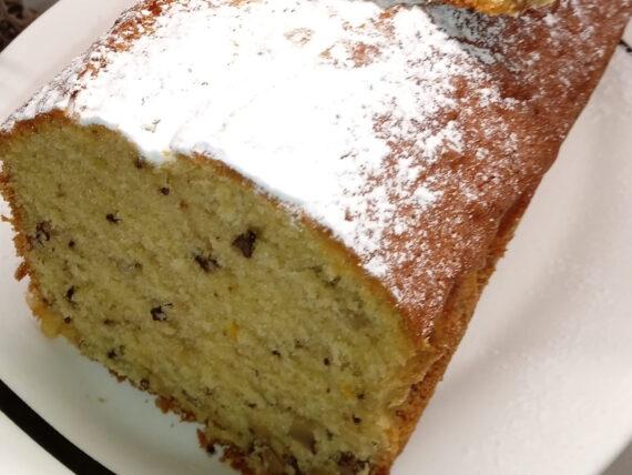 Αφράτο και μυρωδάτο κέικ πορτοκαλιού με καρύδια σε μακρόστενη φόρμα για να συνοδεύσετε το καφεδάκι σας και να τρατάρετε τους καλεσμένους σας.