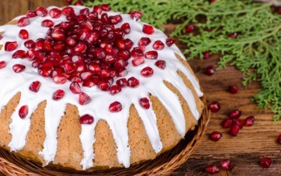 500 γρ. αλεύρι που φουσκώνει μόνο του 250 γρ. βούτυρο ή μαργαρίνη 440 γρ. ζάχαρη 4 αβγά 260 ml γάλα 2 βανίλιες 1 1/2 φλιτζάνι του τσαγιού ρόδι καθαρισμένο 1/2 φλιτζάνι του τσαγιού καρύδια ψιλοκομμένα Για το γλάσο